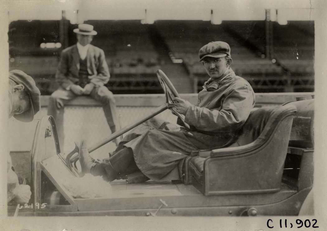 Close-up view of driver in car during 1910 Brighton Beach races in New York. Man sits on fence in background. Stamped on back: "Spooner & Wells, Inc., photographers, telephones 3472-3473 Columbus, 1931 Broadway, New York." Handwritten on back: "Races and racing--Brighton Beach, 1910."