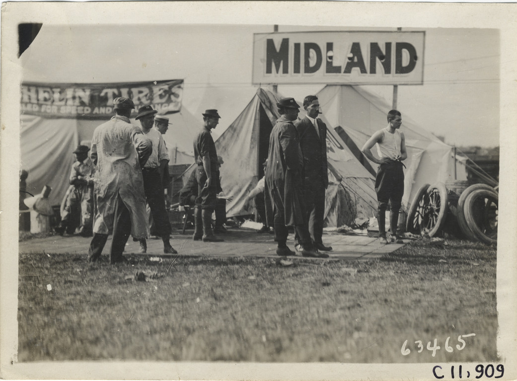 View of men standing on wooden platform in front of Midland tent during 1910 Brighton Beach races in New York. Tires stacked in background. Stamped on back: "Spooner & Wells, Inc., photographers, telephones 3472-3473 Columbus, 1931 Broadway, New York." Handwritten on back: "Races and racing--Brighton Beach, 1910."
