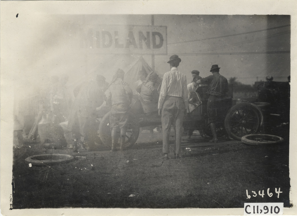 View of men working on Midland car during 1910 Brighton Beach races in New York. "Midland" sign displayed over tent in background. Stamped on back: "Spooner & Wells, Inc., photographers, telephones 3472-3473 Columbus, 1931 Broadway, New York." Handwritten on back: "Races and racing--Brighton Beach, 1910."