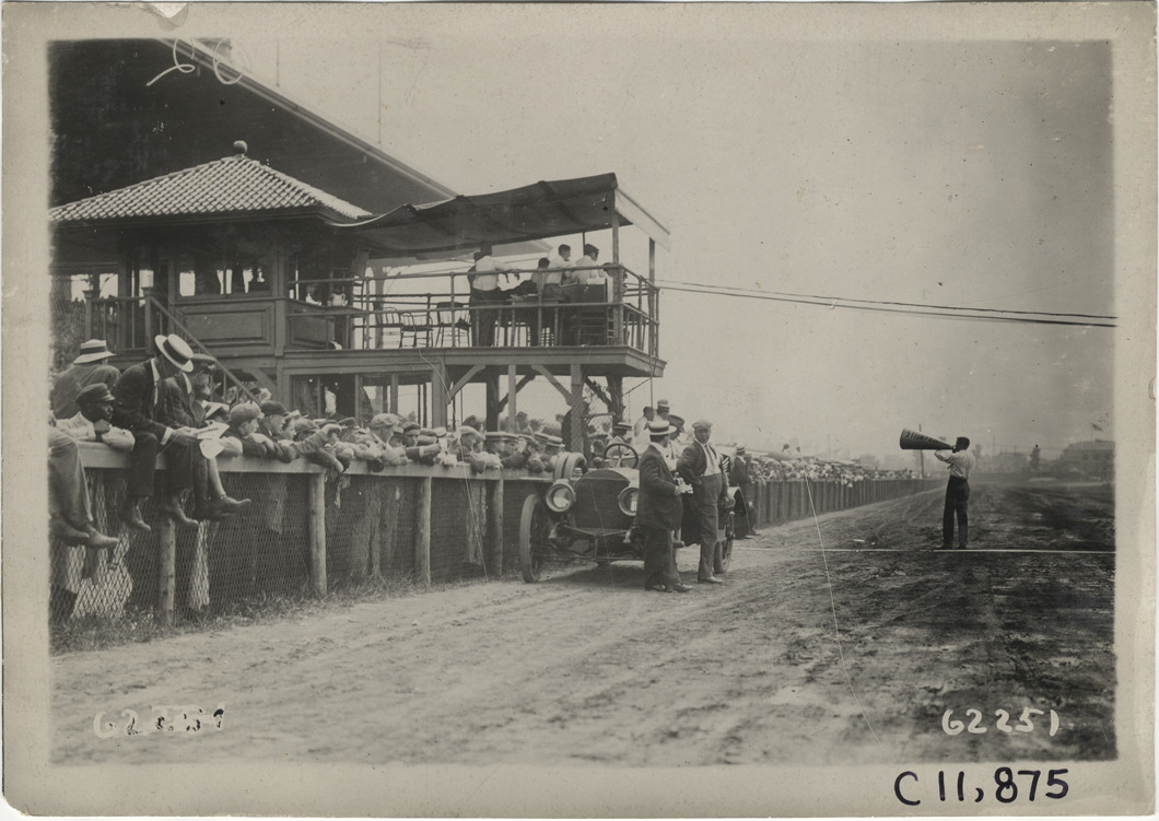 View of spectators at edge of racetrack during 1910 Brighton Beach races in New York. Car parked on track; announcer holds megaphone. Stamped on back: "Spooner & Wells, Inc., photographers, telephones 3472-3473 Columbus, 1931 Broadway, New York." Handwritten on back: "Races and racing--Brighton Beach, 1910."