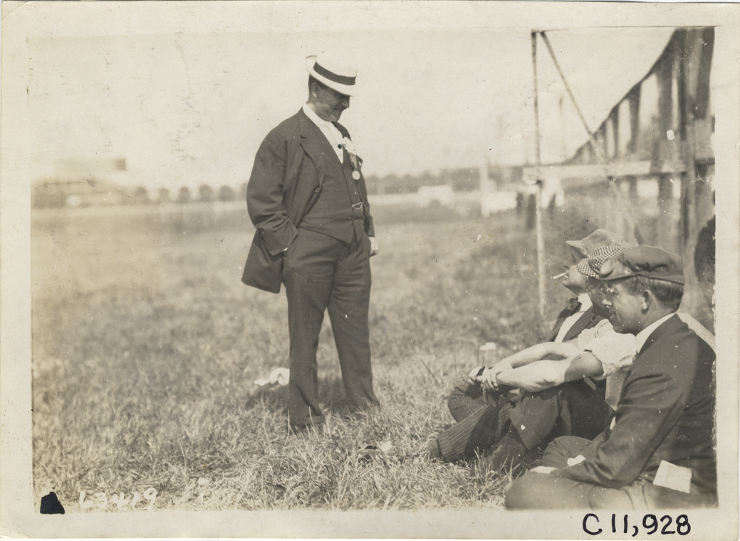 View of man conversing with three men sitting on ground in front of fence during 1910 Brighton Beach races in New York. Stamped on back: "Spooner & Wells, Inc., photographers, telephones 3472-3473 Columbus, 1931 Broadway, New York." Handwritten on back: "Races and racing--Brighton Beach, 1910."