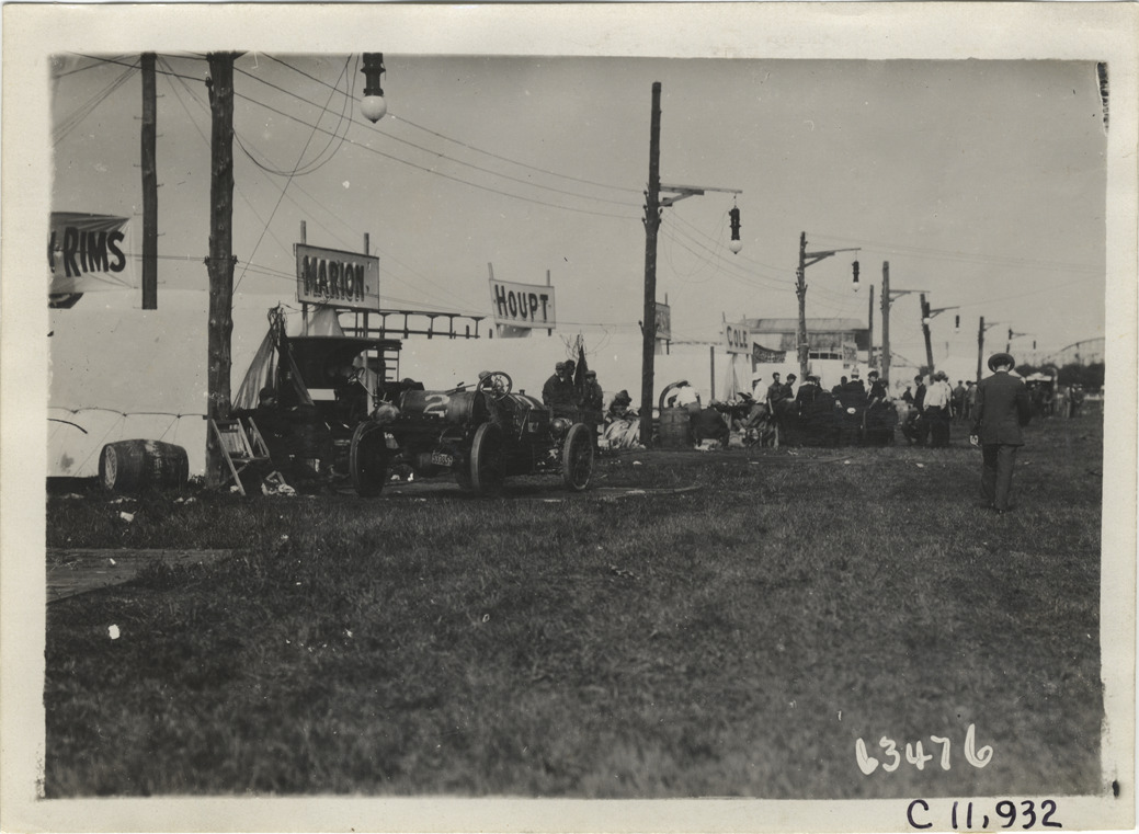 View of Marion car no. 2 in front of row of tents during 1910 Brighton Beach races in New York. "Marion" sign displayed over tent in foreground. Stamped on back: "Spooner & Wells, Inc., photographers, telephones 3472-3473 Columbus, 1931 Broadway, New York." Handwritten on back: "Races and racing--Brighton Beach, 1910."