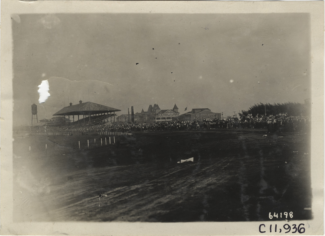 View of racetrack during 1910 Brighton Beach races in New York. Crowds, grandstand and Brighton Beach Music Hall in background. Stamped on back: "Spooner & Wells, Inc., photographers, telephones 3472-3473 Columbus, 1931 Broadway, New York." Handwritten on back: "Races and racing--Brighton Beach, 1910."
