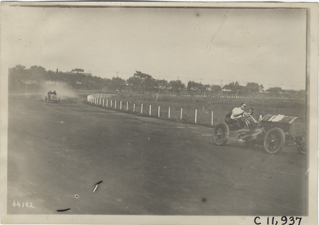 View of two cars racing on track during 1910 Brighton Beach races in New York. Car no. 10 in background. Stamped on back: "Spooner & Wells, Inc., photographers, telephones 3472-3473 Columbus, 1931 Broadway, New York." Handwritten on back: "Races and racing--Brighton Beach, 1910."