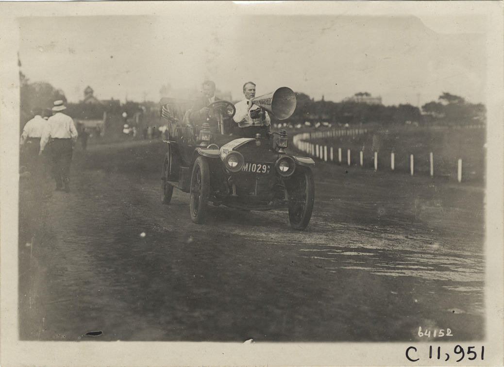 Peter Prunty with megaphone in automobile, 1910 Brighton Beach races