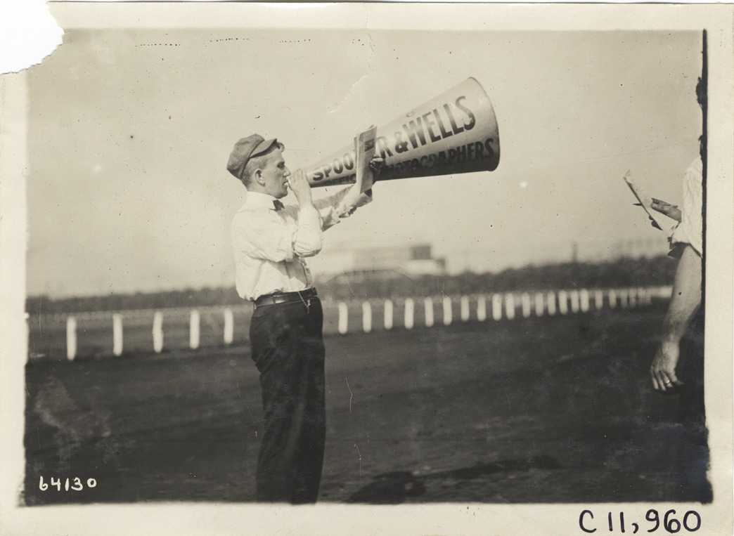 View of announcer Peter Prunty holding a megaphone and documents during 1910 Brighton Beach races in New York. "Spooner & Wells, official photographers, 1931 B'way., N.Y." printed on megaphone. Stamped on back: "Spooner & Wells, Inc., photographers, telephones 3472-3473 Columbus, 1931 Broadway, New York." Handwritten on back: "Races and racing--Brighton Beach, 1910."