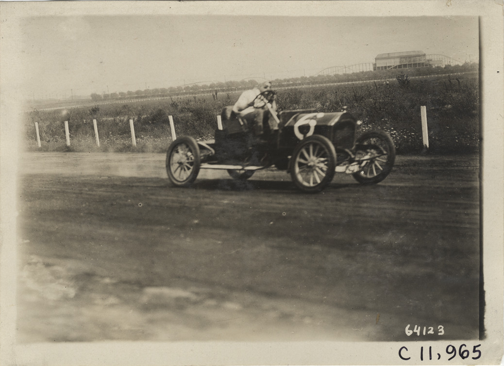View of driver racing car no. 6 on track during 1910 Brighton Beach races in New York. Stamped on back: "Spooner & Wells, Inc., photographers, telephones 3472-3473 Columbus, 1931 Broadway, New York." Handwritten on back: "Races and racing--Brighton Beach, 1910."