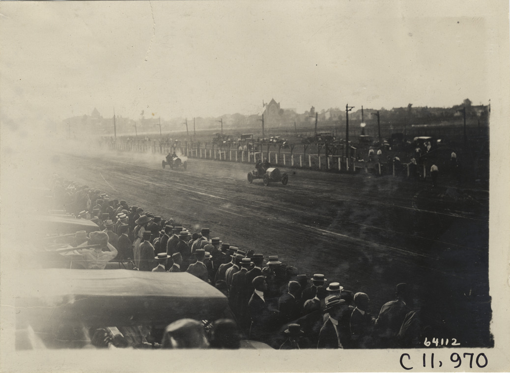 View of two cars racing on track during 1910 Brighton Beach races in New York. Crowd of spectators in foreground. Stamped on back: "Spooner & Wells, Inc., photographers, telephones 3472-3473 Columbus, 1931 Broadway, New York." Handwritten on back: "Races and racing--Brighton Beach, 1910."