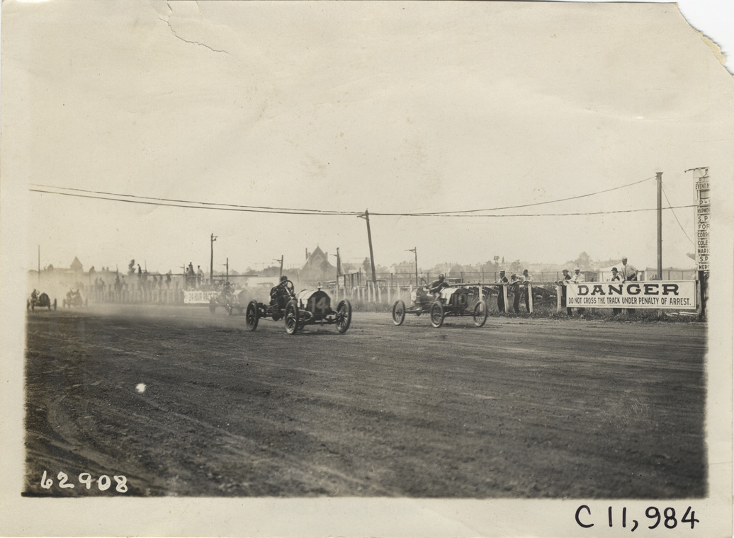 View of Mercer car no. 14, driven by E.H. Sherwood, and Ford Special car no. 10, driven by Frank Kulick, racing on track during 1910 Brighton Beach races in New York. "Danger, do not cross the track under penalty of arrest" banner displayed on railing. Stamped on back: "Spooner & Wells, Inc., photographers, telephones 3472-3473 Columbus, 1931 Broadway, New York." Handwritten on back: "Races and racing--Brighton Beach, 1910."