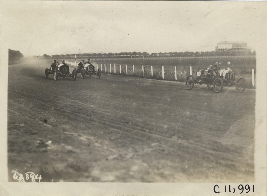 View of three cars racing on track during 1910 Brighton Beach races in New York. Frank Kulick, in Ford Special car no. 10, in lead. National car no. 9, driven by Louis Disbrow. Palmer-Singer car no. 18, driven by Wilson. Stamped on back: "Spooner & Wells, Inc., photographers, telephones 3472-3473 Columbus, 1931 Broadway, New York." Handwritten on back: "Races and racing--Brighton Beach, 1910."