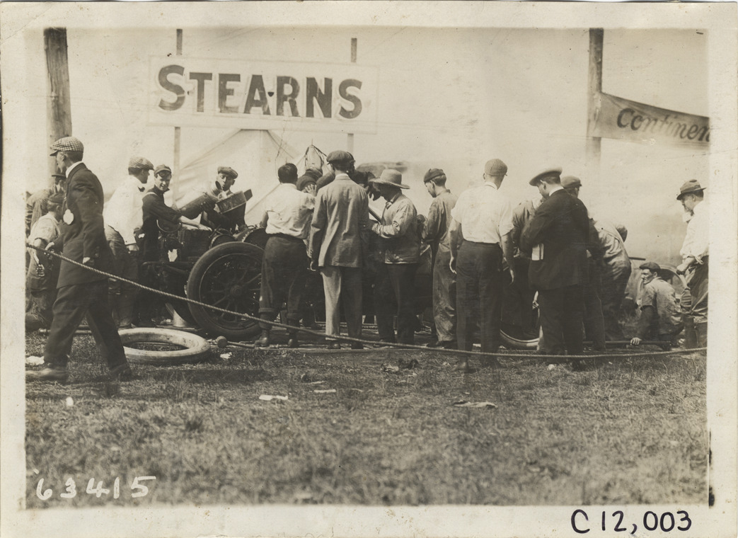 View of men working on Stearns car during 1910 Brighton Beach races in New York. "Stearns" sign displayed over tent in background. Stamped on back: "Spooner & Wells, Inc., photographers, telephones 3472-3473 Columbus, 1931 Broadway, New York." Handwritten on back: "Races and racing--Brighton Beach, 1910."