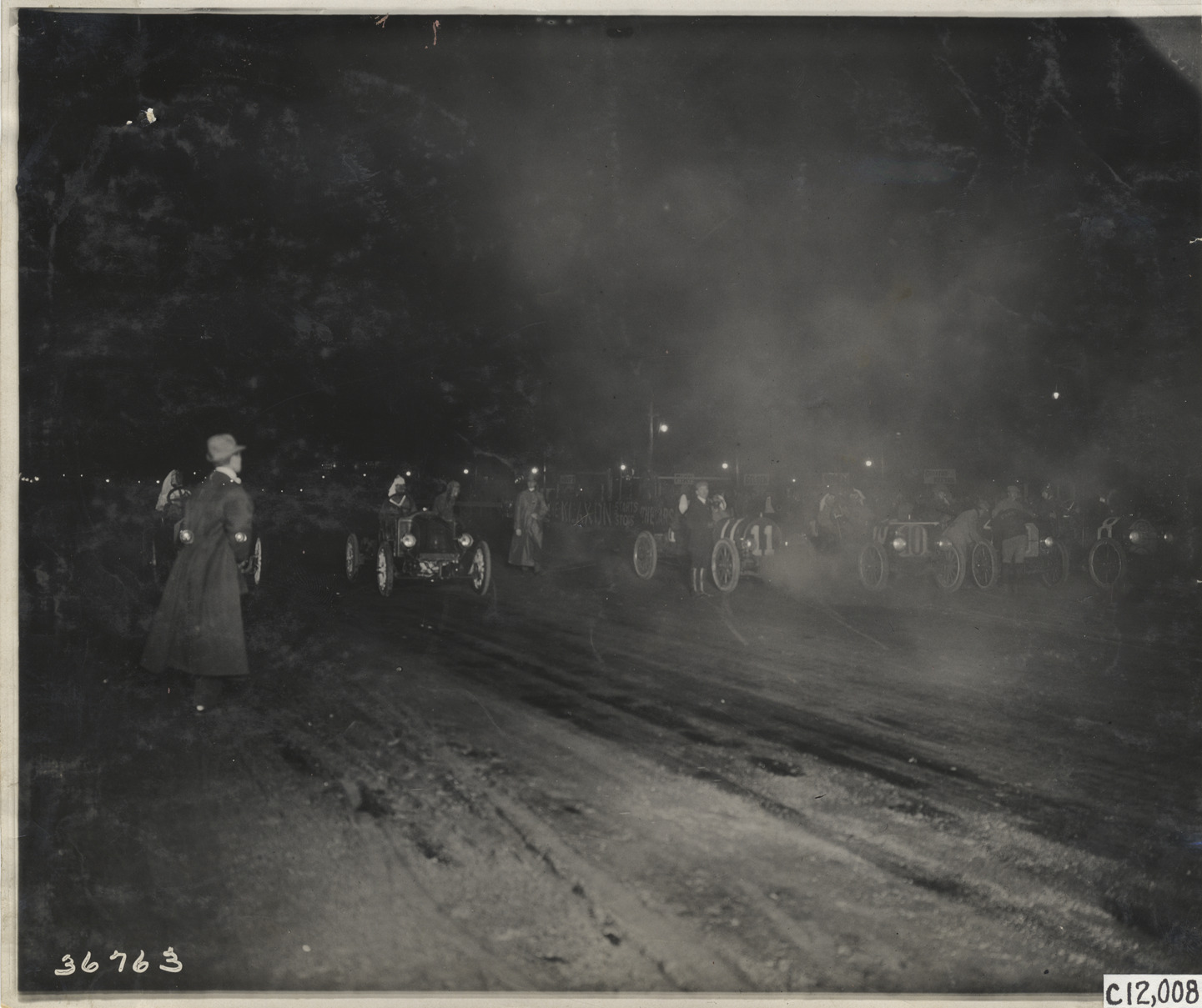 Nighttime view of cars waiting at starting line during 1910 Brighton Beach races in New York. Stamped on back: "Spooner & Wells, Inc., photographers, telephones 3472-3473 Columbus, 1931 Broadway, New York." Handwritten on back: "Races and racing--Brighton Beach, 1910."