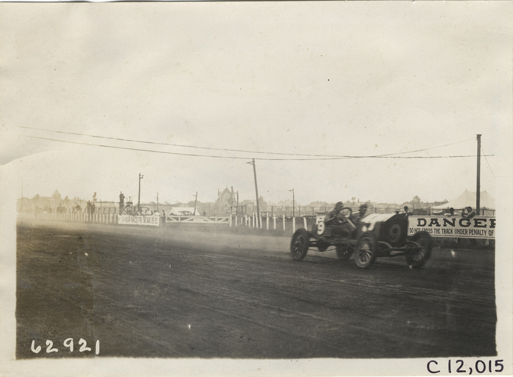 View of driver and passenger racing car no. 9 on track during 1910 Brighton Beach races in New York. "Danger, do not cross the track under penalty of arrest" banner displayed on railing. Stamped on back: "Spooner & Wells, Inc., photographers, telephones 3472-3473 Columbus, 1931 Broadway, New York." Handwritten on back: "Races and racing--Brighton Beach, 1910."