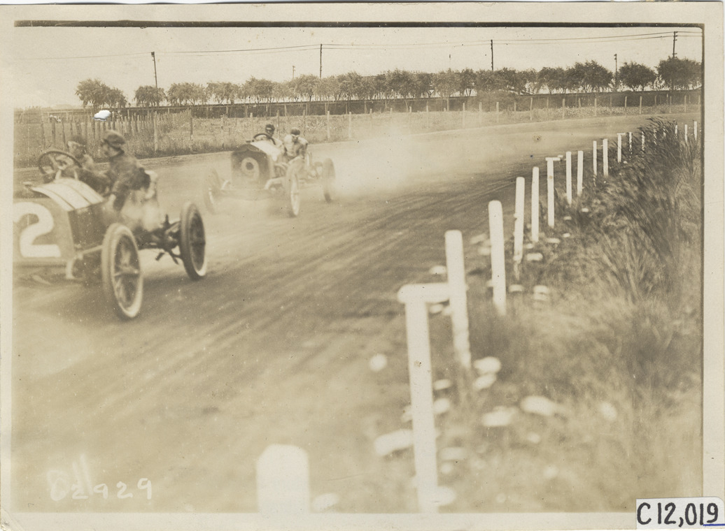 View of cars no. 2 and no. 9 racing on track during 1910 Brighton Beach races in New York. Car no. 2 in lead. Stamped on back: "Spooner & Wells, Inc., photographers, telephones 3472-3473 Columbus, 1931 Broadway, New York." Handwritten on back: "Races and racing--Brighton Beach, 1910."