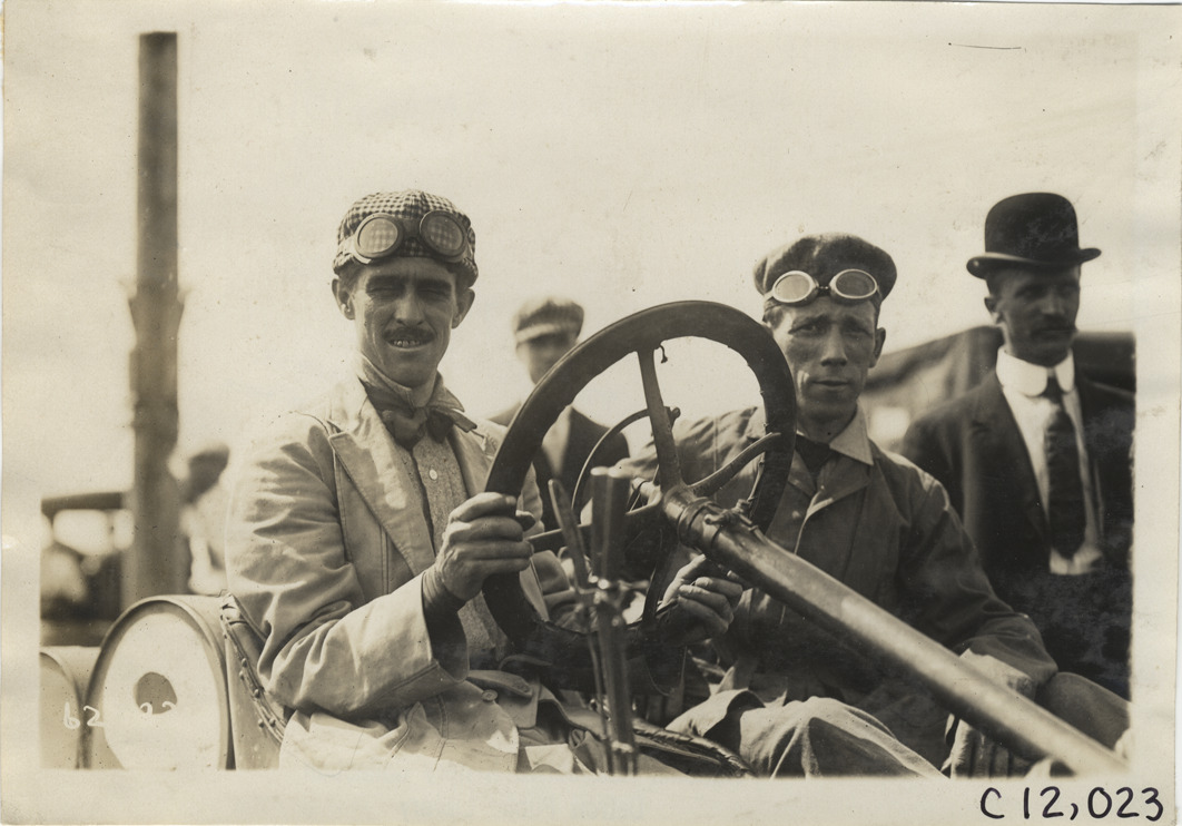 Driver and passenger in racecar, 1910 Brighton Beach races