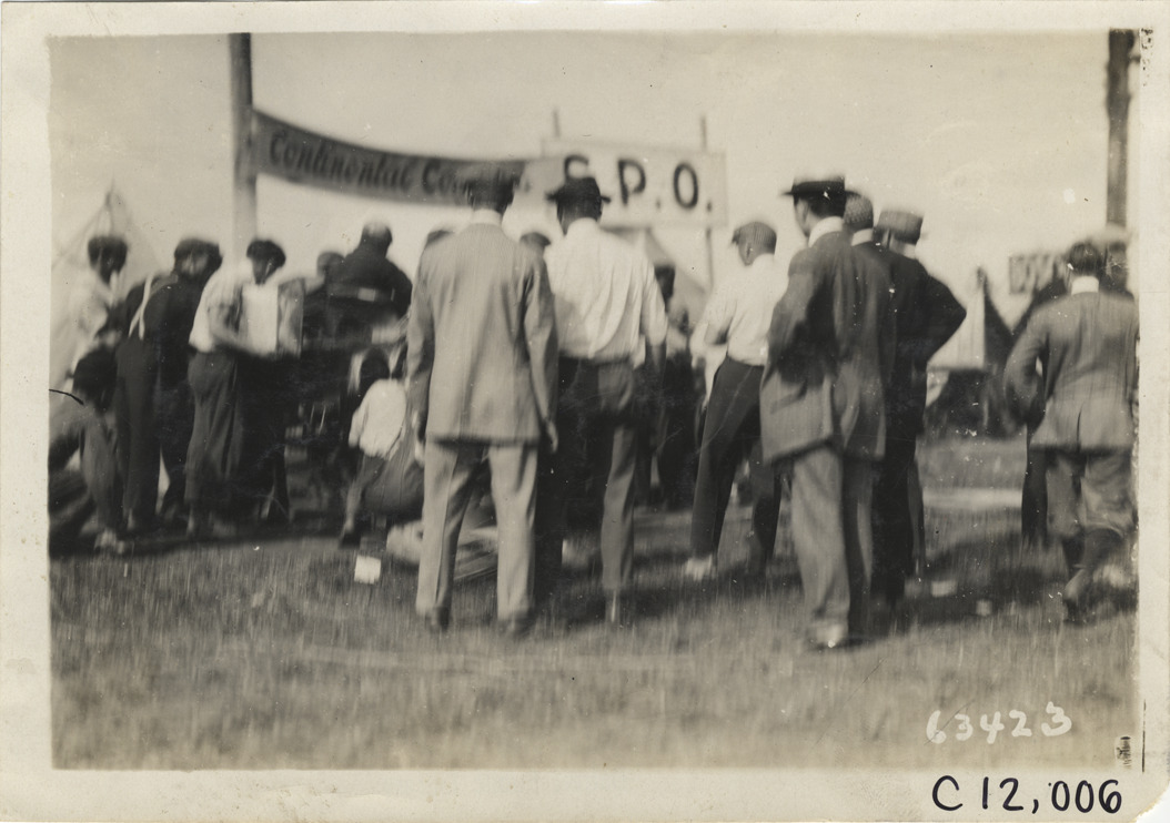View of men surrounding car during 1910 Brighton Beach races in New York. "Continental Controls" and "S.P.O." signs in background. Stamped on back: "Spooner & Wells, Inc., photographers, telephones 3472-3473 Columbus, 1931 Broadway, New York." Handwritten on back: "Races and racing--Brighton Beach, 1910."