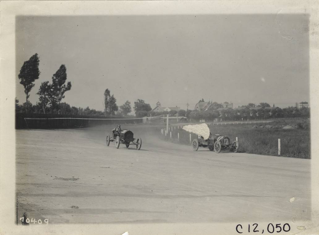 View of cars no. 12 and no. 31 racing on track during 1911 Brighton Beach races in New York. Stamped on back: "Spooner & Wells, Inc., photographers, telephones 3472-3473 Columbus, 1931 Broadway, New York." Handwritten on back: "Races and racing--Brighton Beach, 1911."