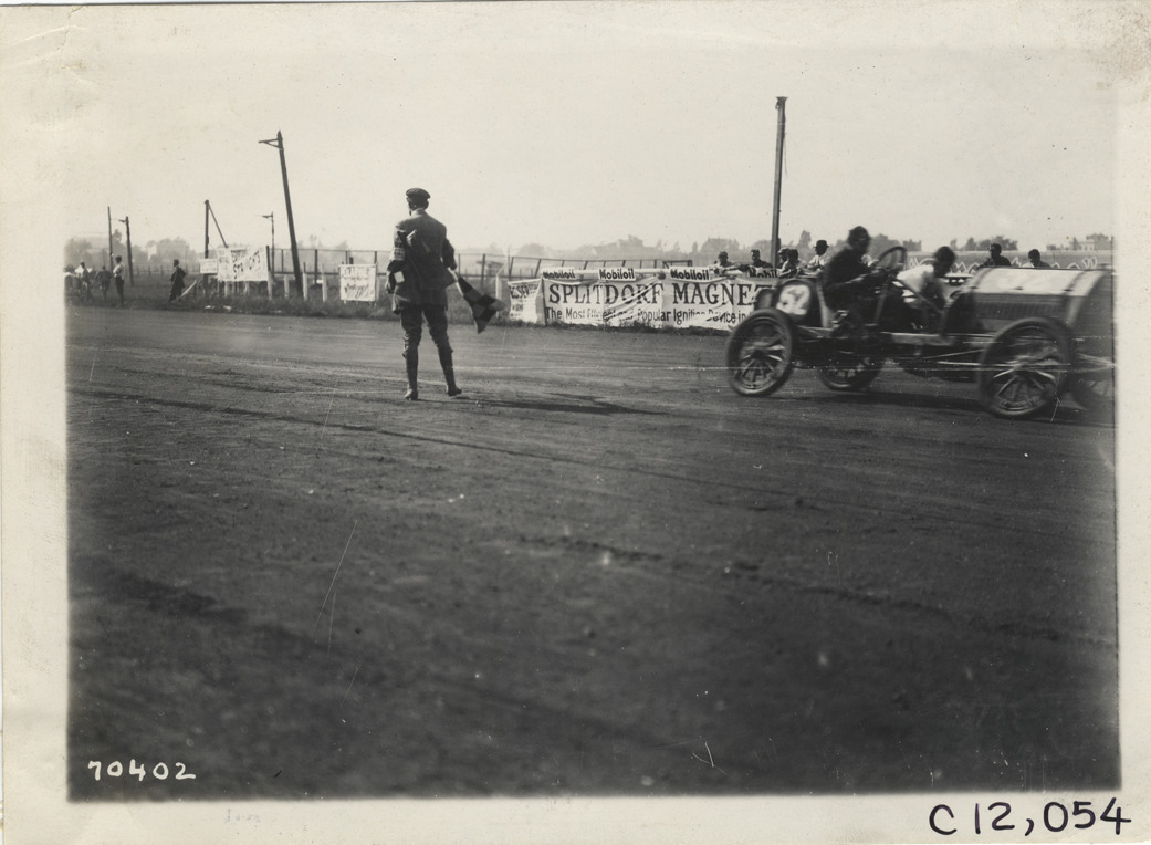 Racecar crossing finish line, 1911 Brighton Beach races
