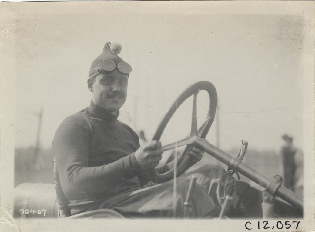Close-up view of driver Jack Tower in racecar during 1911 Brighton Beach races in New York. Stamped on back: "Spooner & Wells, Inc., photographers, telephones 3472-3473 Columbus, 1931 Broadway, New York." Handwritten on back: "Jack Tower. Races and racing--Brighton Beach, 1911."