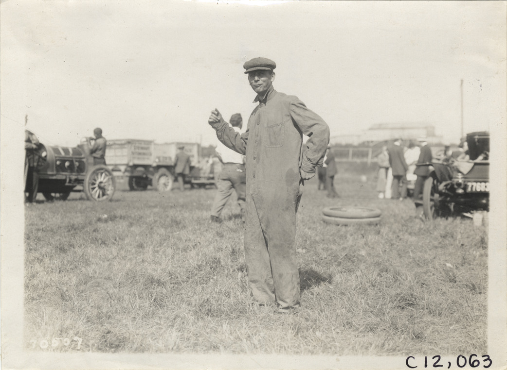 View of mechanic wearing coveralls at 1911 Brighton Beach races in New York. Vehicles in background. Stamped on back: "Spooner & Wells, Inc., photographers, telephones 3472-3473 Columbus, 1931 Broadway, New York." Handwritten on back: "Races and racing--Brighton Beach, 1911."