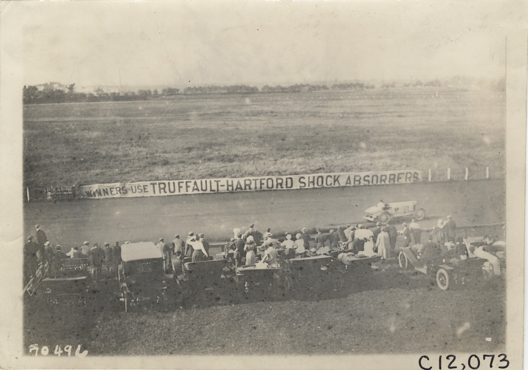View of banner advertising Truffault-Hartford shock absorbers banner displayed on racetrack railing during 1911 Brighton Beach races in New York. Banner reads: "Winners use Truffault-Hartford shock absorbers." Stamped on back: "Spooner & Wells, Inc., photographers, telephones 3472-3473 Columbus, 1931 Broadway, New York." Handwritten on back: "Races and racing--Brighton Beach, 1911."