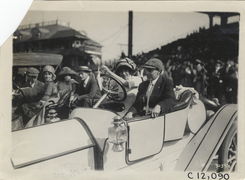 View of a man and woman sitting in car at side of racetrack during 1911 Brighton Beach races in New York. Stamped on back: "Spooner & Wells, Inc., photographers, telephones 3472-3473 Columbus, 1931 Broadway, New York." Handwritten on back: "Races and racing--Brighton Beach, 1911."