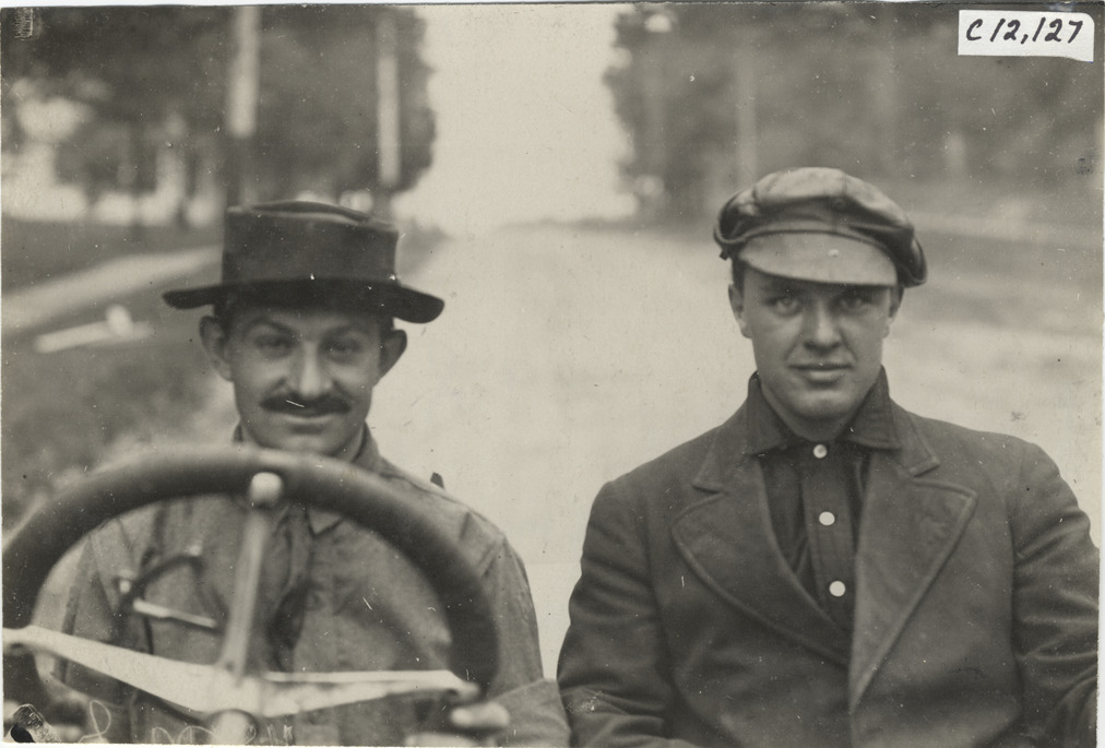 Close-up view of Billy Knipper and passenger in car during the 1909 Crown Point races in Indiana. Stamped on back: "Spooner & Wells, Inc., photographers, telephones 3472-3473 Columbus, 1931 Broadway, New York." Handwritten on back: "Races and racing--Crown Point races, 1909."