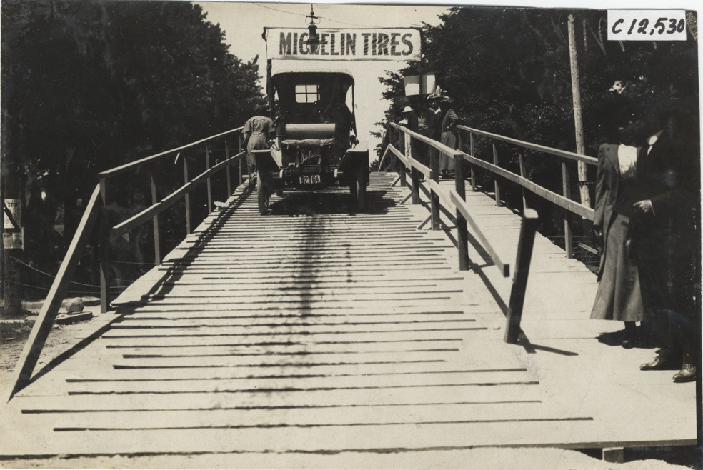 View of Petrel car crossing wooden bridge during the 1909 Crown Point races in Indiana. "Michelin tires" sign suspended over bridge in background. Stamped on back: "Spooner & Wells, Inc., photographers, telephones 3472-3473 Columbus, 1931 Broadway, New York." Handwritten on back: "Races and racing--Crown Point races, 1909."