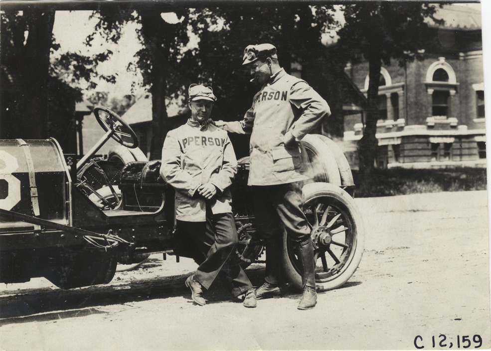 View of two racecar drivers standing next to Apperson car during the 1909 Crown Point races in Indiana. Men wear "Apperson" jackets. Stamped on back: "Spooner & Wells, Inc., photographers, telephones 3472-3473 Columbus, 1931 Broadway, New York." Handwritten on back: "Races and racing--Crown Point races, 1909."
