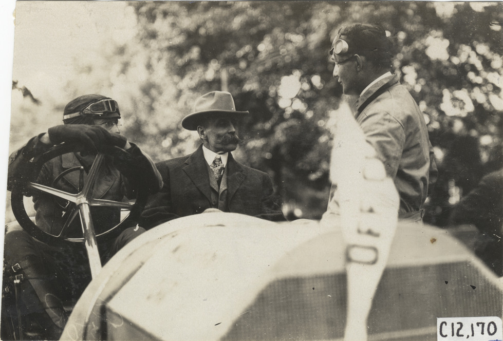 Racecar driver speaking with driver and racing official in automobile, 1909 Crown Point races