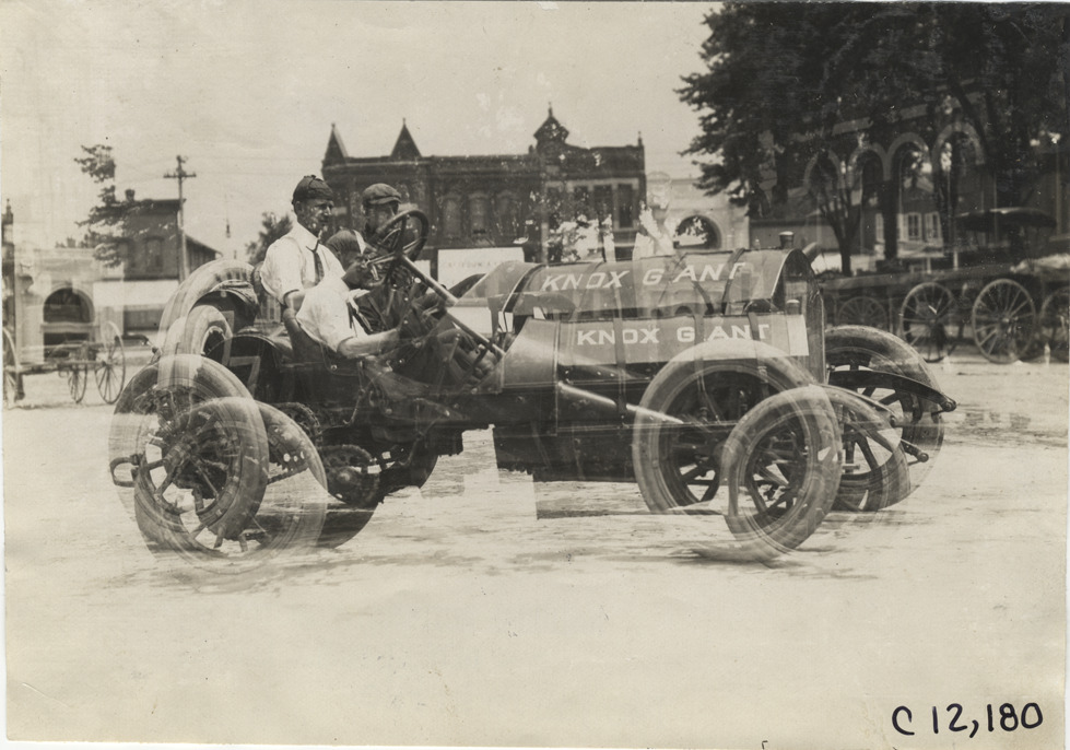 View of driver and passenger in Knox Giant car no. 7 during the 1909 Crown Point races in Indiana. Double-exposure. Stamped on back: "Spooner & Wells, Inc., photographers, telephones 3472-3473 Columbus, 1931 Broadway, New York." Handwritten on back: "Races and racing--Crown Point races, 1909."