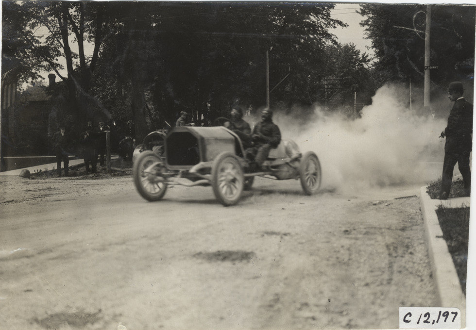 View of driver and passenger racing car on course during the 1909 Crown Point races in Indiana. Spectators watch from roadside. Stamped on back: "Spooner & Wells, Inc., photographers, telephones 3472-3473 Columbus, 1931 Broadway, New York." Handwritten on back: "Races and racing--Crown Point races, 1909."