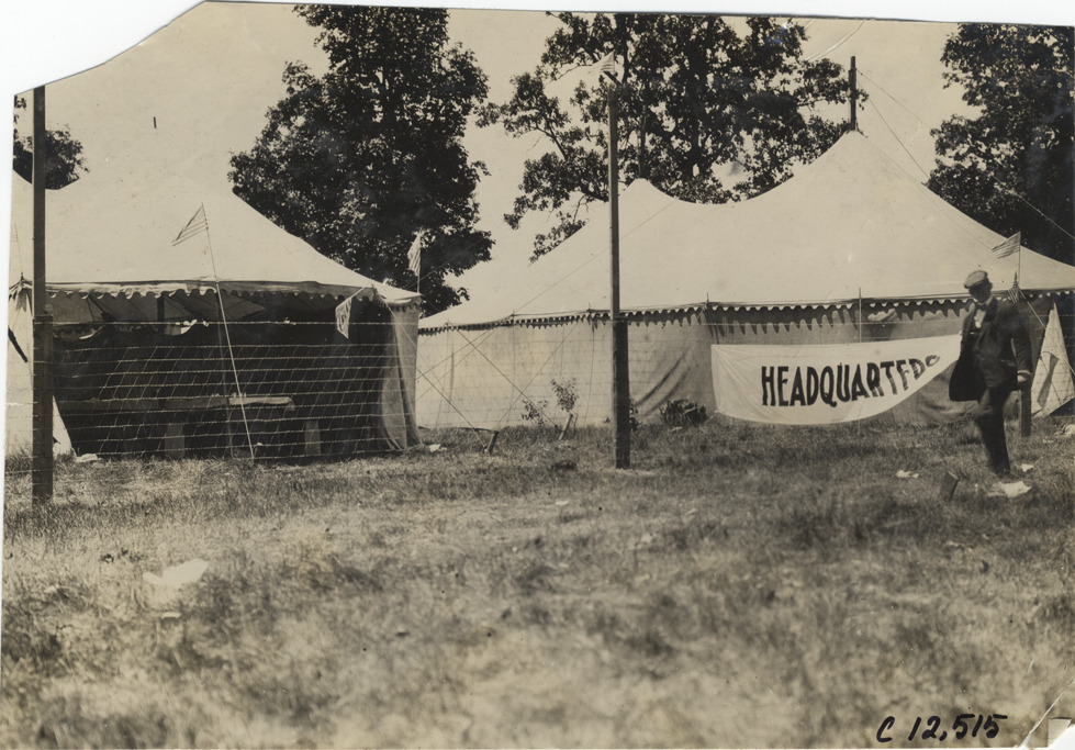 View of man walking in front of two tents during the 1909 Crown Point races in Indiana. "Headquarters" banner displayed on fence in front of tents. Stamped on back: "Spooner & Wells, Inc., photographers, telephones 3472-3473 Columbus, 1931 Broadway, New York." Handwritten on back: "Races and racing--Crown Point races, 1909."