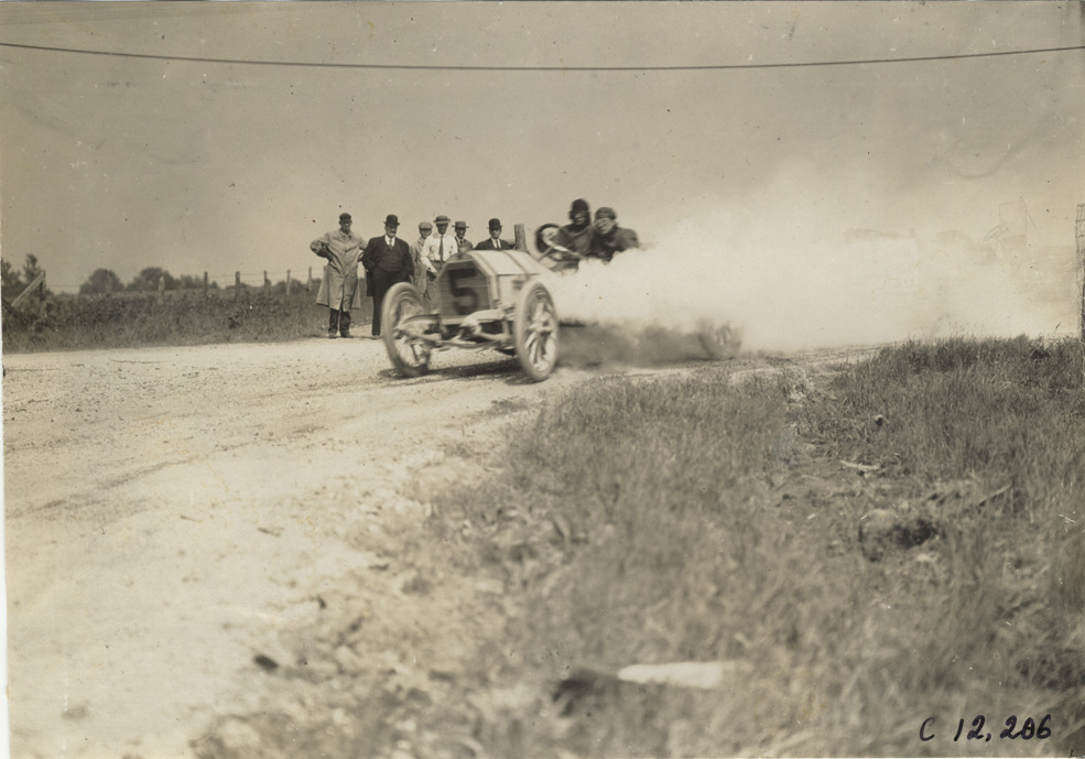 View of Billy Knipper racing Chalmers-Detroit car no. 5 on course during the 1909 Crown Point races in Indiana. Stamped on back: "Spooner & Wells, Inc., photographers, telephones 3472-3473 Columbus, 1931 Broadway, New York." Handwritten on back: "Billy Knipper, Chalmers-Detroit at Merry Widow's Leg Turn, Crown Point course, Ind. Races and racing--Crown Point races, 1909."