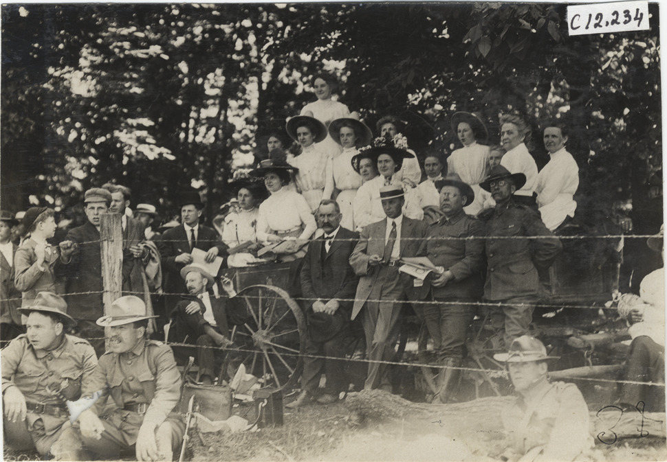 View of men and women watching race from wagon during the 1909 Crown Point races in Indiana. Soldiers sit in front of barbed wire fence in foreground. Stamped on back: "Spooner & Wells, Inc., photographers, telephones 3472-3473 Columbus, 1931 Broadway, New York." Handwritten on back: "Races and racing--Crown Point races, 1909."