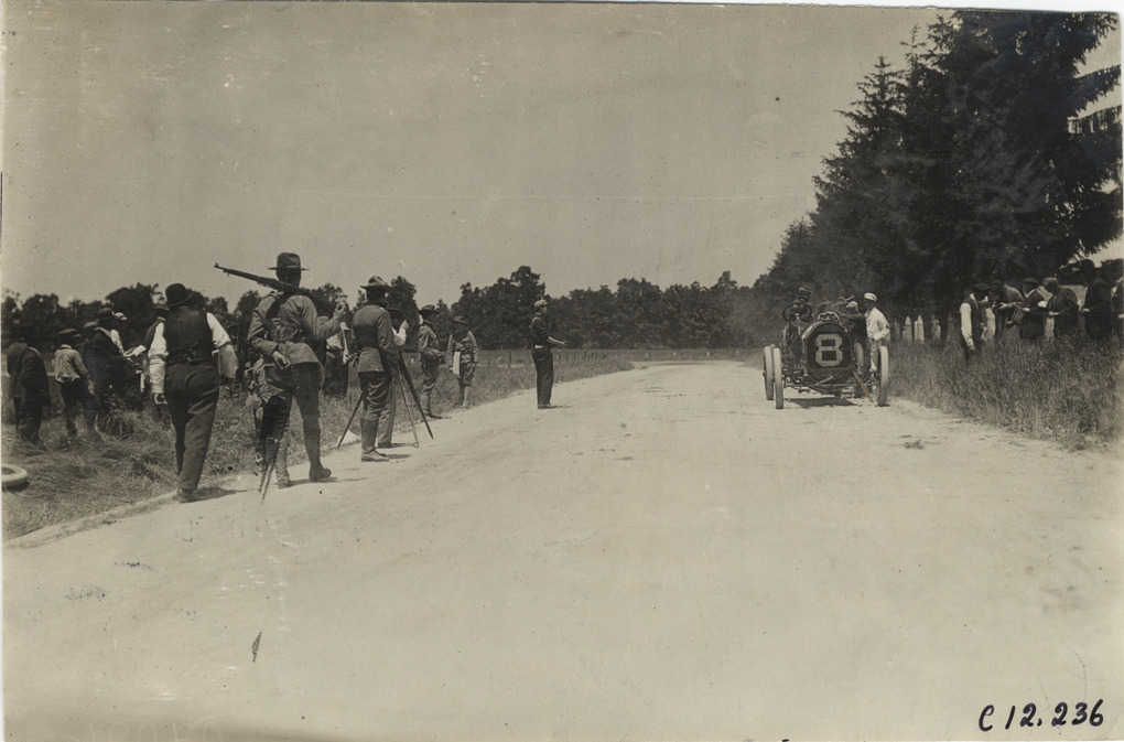 View of car no. 8 parked on side of road during the 1909 Crown Point races in Indiana. Soldiers and photographer stand in road; spectators watch from roadside. Stamped on back: "Spooner & Wells, Inc., photographers, telephones 3472-3473 Columbus, 1931 Broadway, New York." Handwritten on back: "Races and racing--Crown Point races, 1909."