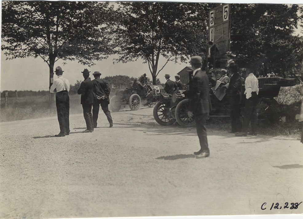 View of spectators watching car no. 8 racing on course during the 1909 Crown Point races in Indiana. Automobile is parked under scoreboard. Stamped on back: "Spooner & Wells, Inc., photographers, telephones 3472-3473 Columbus, 1931 Broadway, New York." Handwritten on back: "Races and racing--Crown Point races, 1909."