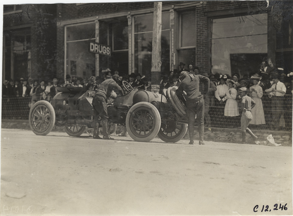 Drivers examining racecar, 1909 Crown Point races