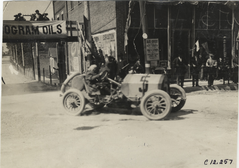 View of driver and passenger racing car no. 5 on course during the 1909 Crown Point races in Indiana. Spectators and commercial buildings in background; "[Use Mon]ogram oils" banner displayed on pedestrian bridge between two buildings. Stamped on back: "Spooner & Wells, Inc., photographers, telephones 3472-3473 Columbus, 1931 Broadway, New York." Handwritten on back: "Races and racing--Crown Point races, 1909."