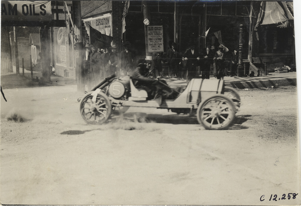 View of driver and passenger racing car no. 5 on course during the 1909 Crown Point races in Indiana. Spectators and commercial buildings in background; "[Use Monogr]am oils" banner displayed on pedestrian bridge between two buildings. Sign advertising band concert displayed on pole. Stamped on back: "Spooner & Wells, Inc., photographers, telephones 3472-3473 Columbus, 1931 Broadway, New York." Handwritten on back: "Races and racing--Crown Point races, 1909."