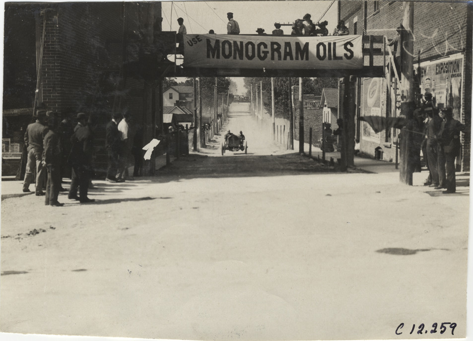 View of driver and passenger racing car no. 1 on course during the 1909 Crown Point races in Indiana. Spectators and commercial buildings on both sides of road; "Use Monogram oils" banner displayed on pedestrian bridge between two buildings. Stamped on back: "Spooner & Wells, Inc., photographers, telephones 3472-3473 Columbus, 1931 Broadway, New York." Handwritten on back: "Races and racing--Crown Point races, 1909."