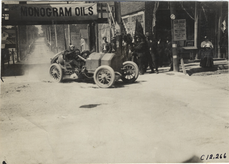 View of driver and passenger racing car no. 1 on course during the 1909 Crown Point races in Indiana. Spectators and commercial buildings in background; "Use Monogram oils" banner displayed on pedestrian bridge between two buildings. Stamped on back: "Spooner & Wells, Inc., photographers, telephones 3472-3473 Columbus, 1931 Broadway, New York." Handwritten on back: "Races and racing--Crown Point races, 1909."