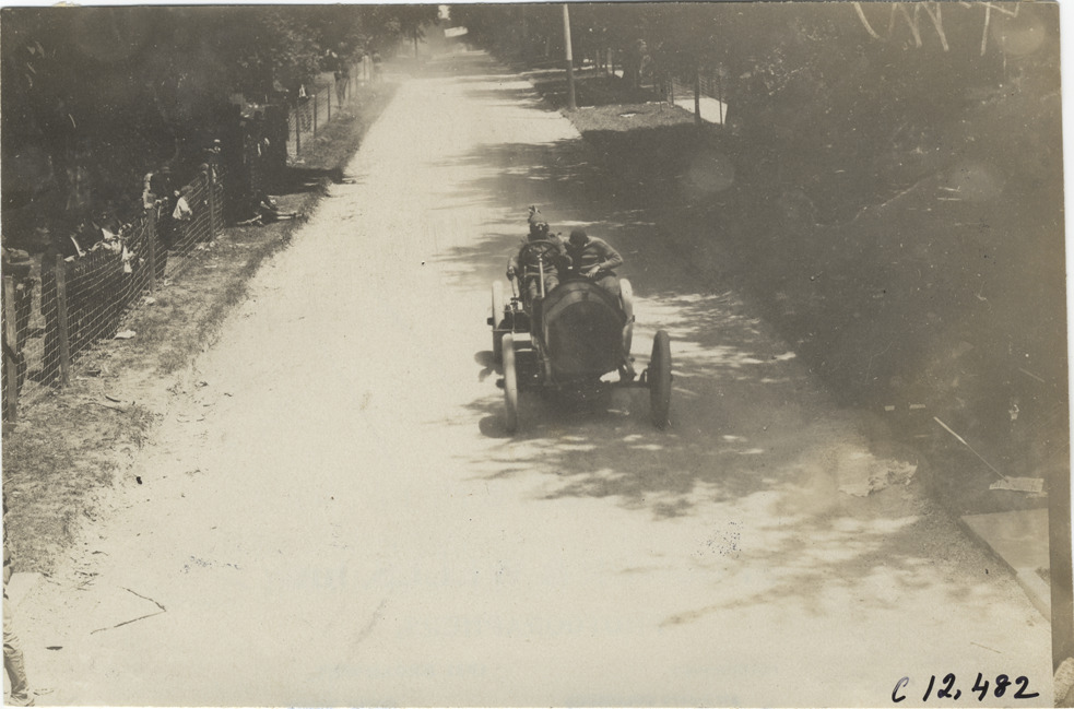 Front view of driver and passenger racing car on course during the 1909 Crown Point races in Indiana. Spectators stand on roadside. Stamped on back: "Spooner & Wells, Inc., photographers, telephones 3472-3473 Columbus, 1931 Broadway, New York." Handwritten on back: "Races and racing--Crown Point races, 1909."