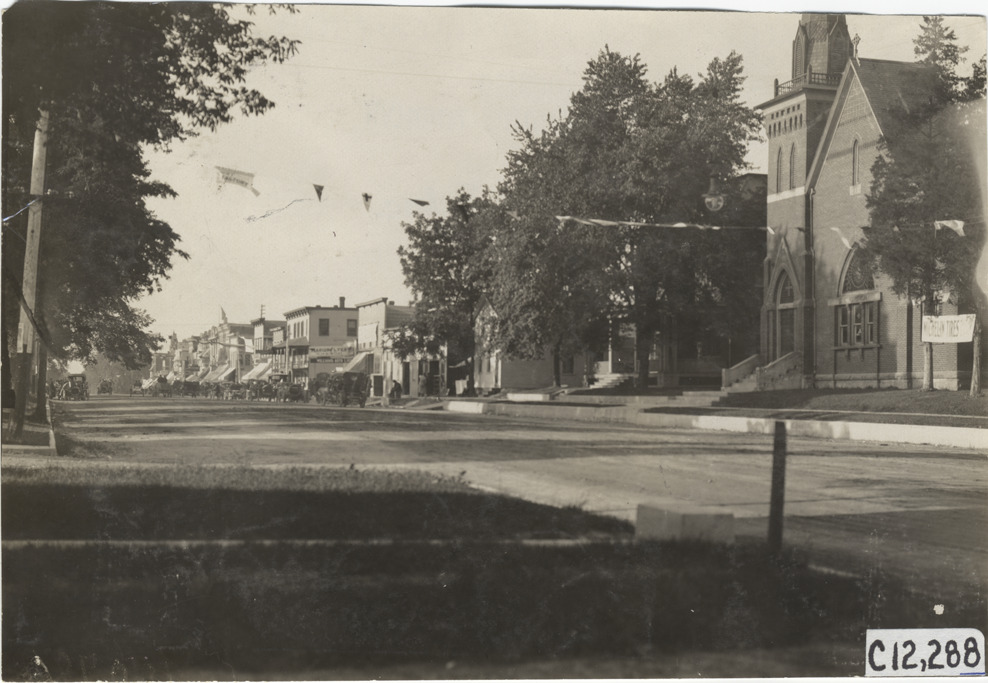 View of street in Crown Point, Indiana during the 1909 Crown Point races. First M.E. Church in foreground; line of cars parked in street and commercial buildings in background. Stamped on back: "Spooner & Wells, Inc., photographers, telephones 3472-3473 Columbus, 1931 Broadway, New York." Handwritten on back: "Races and racing--Crown Point races, 1909."