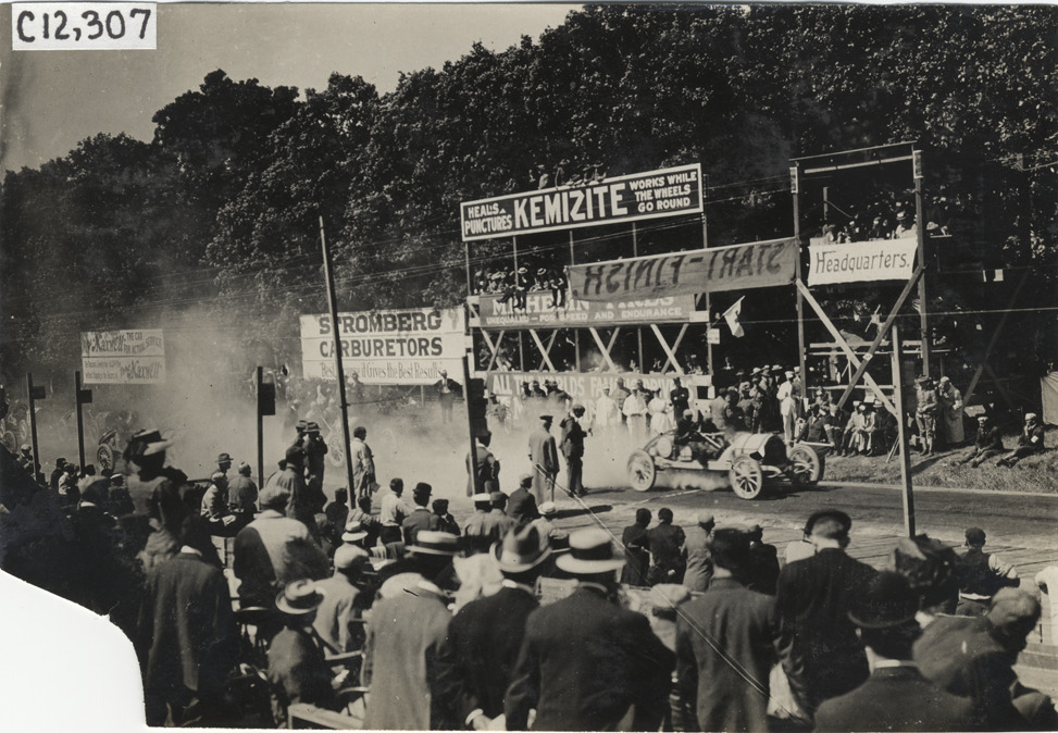 View of car no. 5 parked in front of group of spectators in stands during the 1909 Crown Point races in Indiana. "Start-Finish" banner suspended over road; "Kemizite heals punctures, works while the wheels go round," "Michelin tires," "Headquarters" and "Stromberg carburetors" signs displayed on stands. Stamped on back: "Spooner & Wells, Inc., photographers, telephones 3472-3473 Columbus, 1931 Broadway, New York." Handwritten on back: "Races and racing--Crown Point races, 1909."