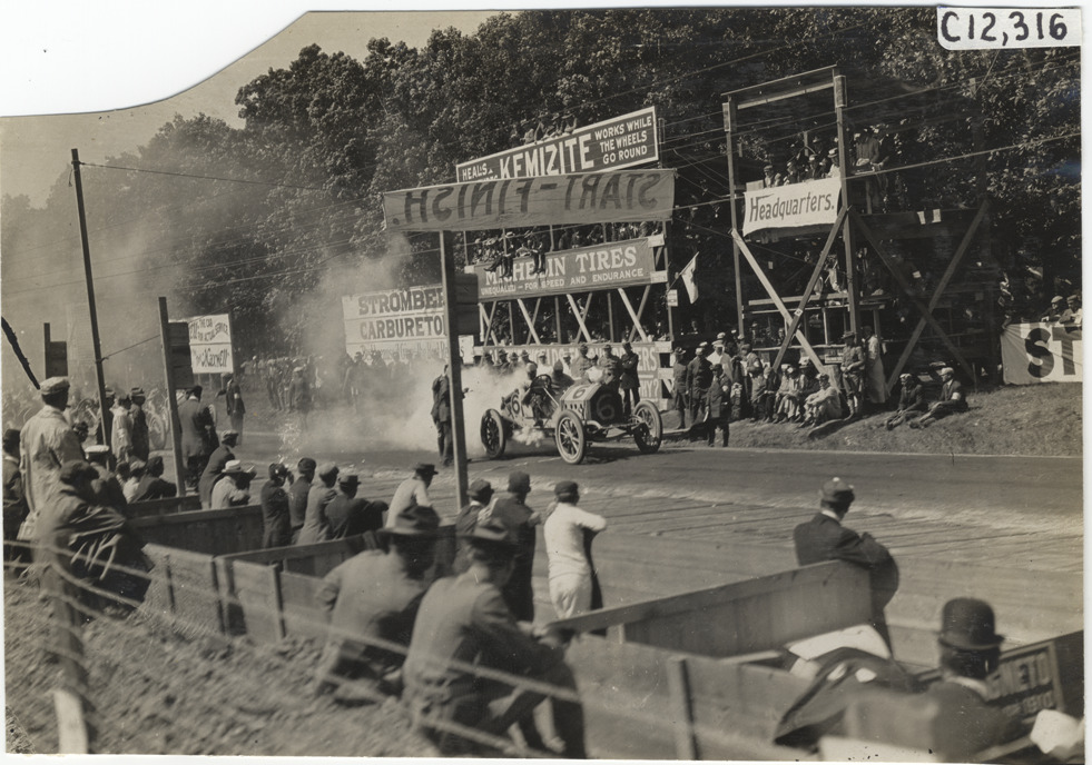 View of car no. 6 parked in front of group of spectators in stands during the 1909 Crown Point races in Indiana. "Start-Finish" banner suspended over road; "Kemizite heals punctures, works while the wheels go round," "Michelin tires," "Headquarters" and "Stromberg carburetors" signs displayed on stands. Pits in foreground. Stamped on back: "Spooner & Wells, Inc., photographers, telephones 3472-3473 Columbus, 1931 Broadway, New York." Handwritten on back: "Races and racing--Crown Point races, 1909."