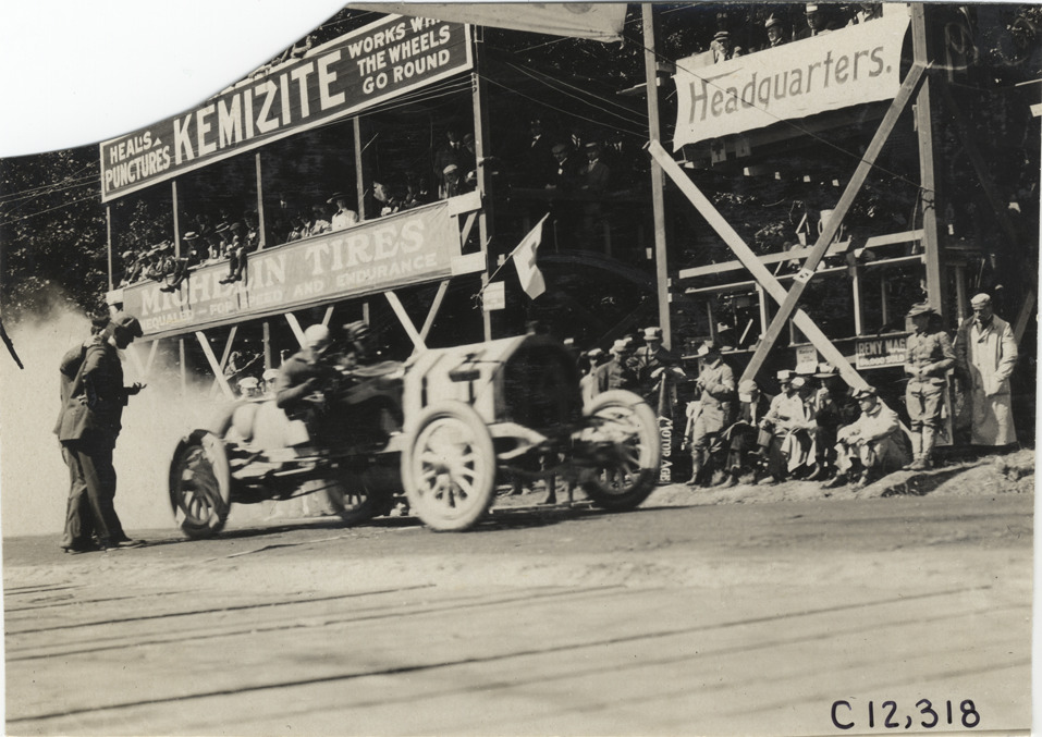 View of car no. 14 parked in front of group of spectators in stands during the 1909 Crown Point races in Indiana. "Kemizite heals punctures, works while the wheels go round," "Michelin tires" and "Headquarters" signs displayed on stands. Stamped on back: "Spooner & Wells, Inc., photographers, telephones 3472-3473 Columbus, 1931 Broadway, New York." Handwritten on back: "Races and racing--Crown Point races, 1909."