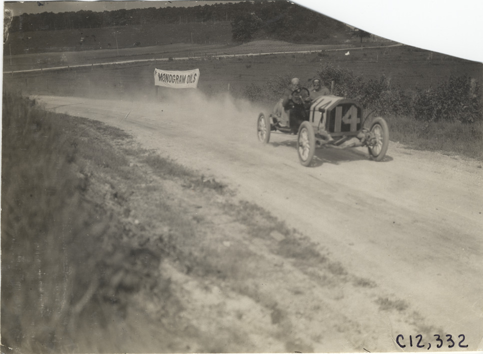 View of driver and passenger racing car no. 14 on course during the 1909 Crown Point races in Indiana. "Use Monogram oils" banner in background. Stamped on back: "Spooner & Wells, Inc., photographers, telephones 3472-3473 Columbus, 1931 Broadway, New York." Handwritten on back: "Races and racing--Crown Point races, 1909."
