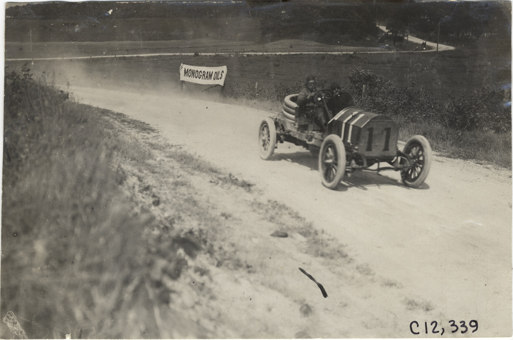 View of driver and passenger racing car no. 11 on course during the 1909 Crown Point races in Indiana. "Use Monogram oils" banner in background. Stamped on back: "Spooner & Wells, Inc., photographers, telephones 3472-3473 Columbus, 1931 Broadway, New York." Handwritten on back: "Races and racing--Crown Point races, 1909."