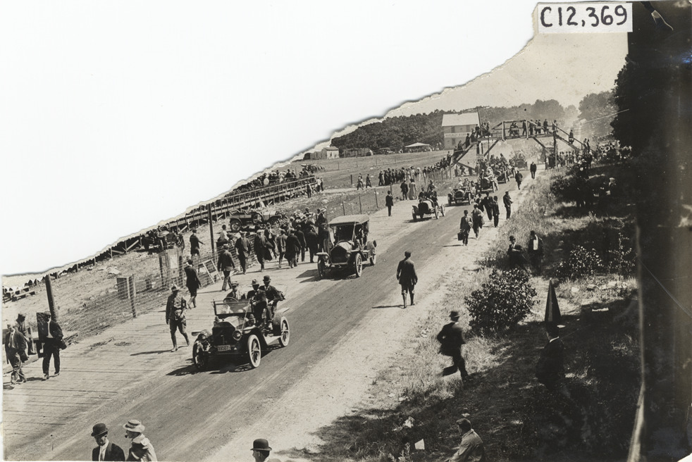View of several automobiles traveling on course in front of bleachers during the 1909 Crown Point races in Indiana. Pedestrian bridge in background. Stamped on back: "Spooner & Wells, Inc., photographers, telephones 3472-3473 Columbus, 1931 Broadway, New York." Handwritten on back: "Races and racing--Crown Point races, 1909."